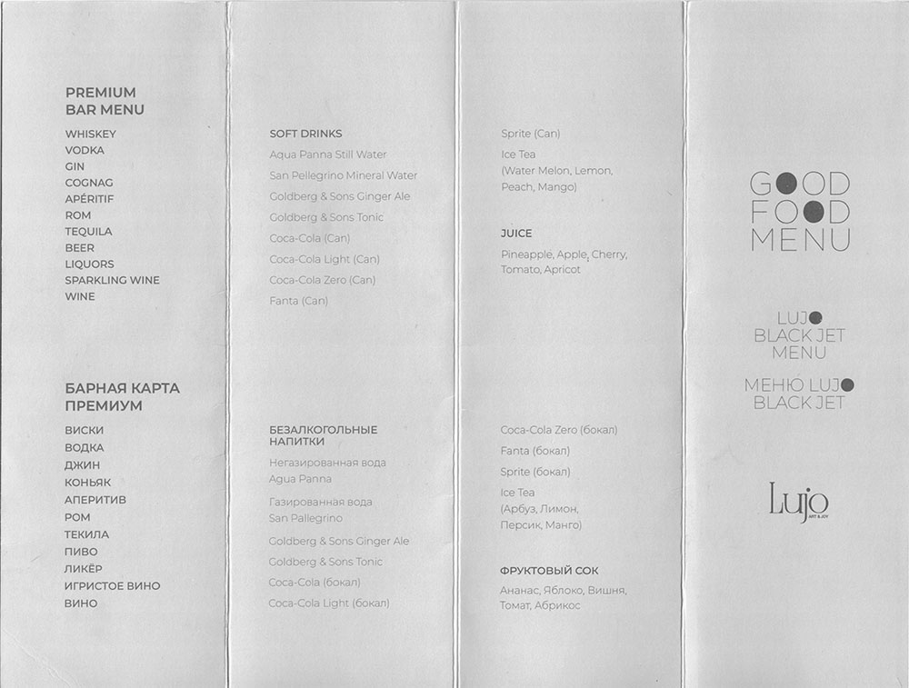 Блюда ресторанного уровня подаются на фарфоровой посуде. Регулярно обновляемое меню включает деликатесы, десерты, а также вегетарианскую и детскую линейки. Приветственный бокал французского шампанского при посадке, а в полёте — премиальный алкоголь, коктейли и кофе в капсулах.